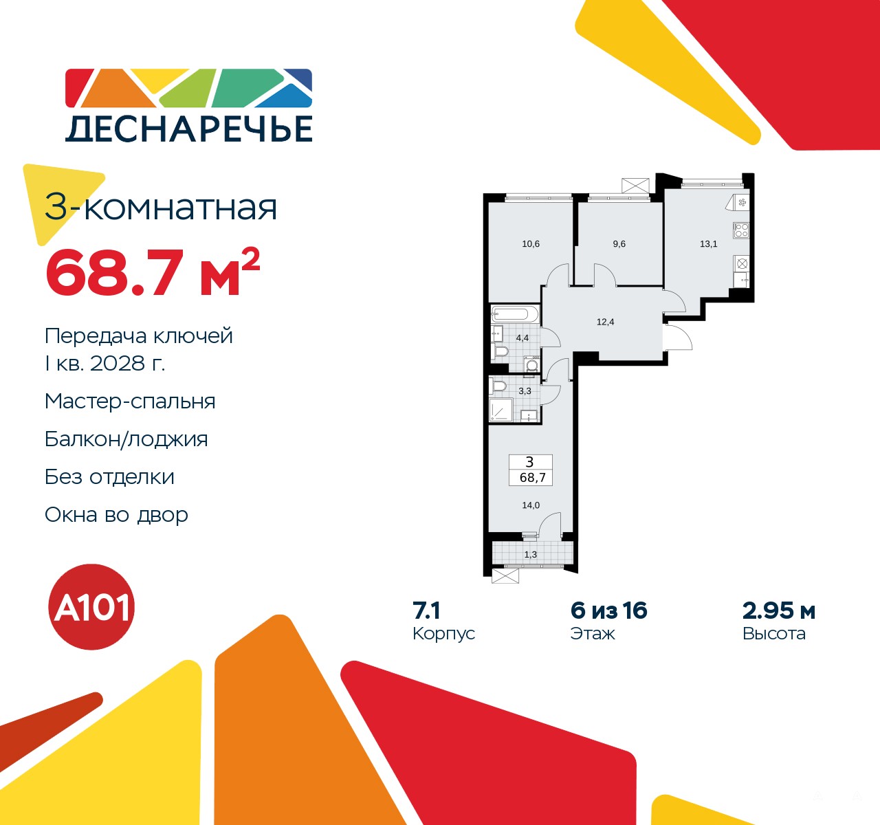 Продается 3-комн. квартира в ЖК "Деснаречье" на 6 этаже. Квартира без отделки, после получения ключей можно делать ремонт. Общая площадь: 68.7 кв.м., жилая: 34.2 кв.м., площадь просторной кухни-столовой: 13.1 кв.м. Квартира - распашонка, без проходных комнат, окна выходят на paзные стороны дома. В квартире одна лоджия, два совмещенных санузла. Высота потолков 2.95 м.