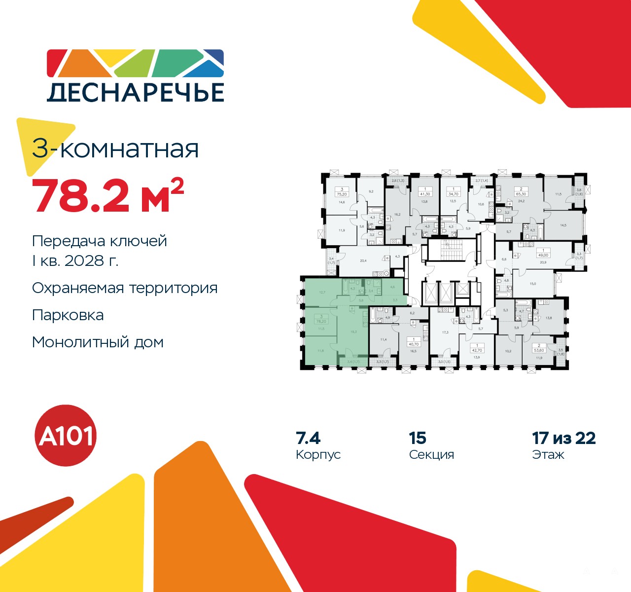 Трехкомнатная квартира от застройщика с отделкой в ЖК "Деснаречье" на 17 этаже. Общая площадь: 78.2 кв.м., жилая: 36 кв.м., площадь просторной кухни-столовой: 19.3 кв.м. Квартира угловая, окна oбecпeчивaют paвнoмepнoe ocвeщeниe в тeчeниe дня. В квартире одна лоджия, два совмещенных санузла. Высота потолков 2.95 м.