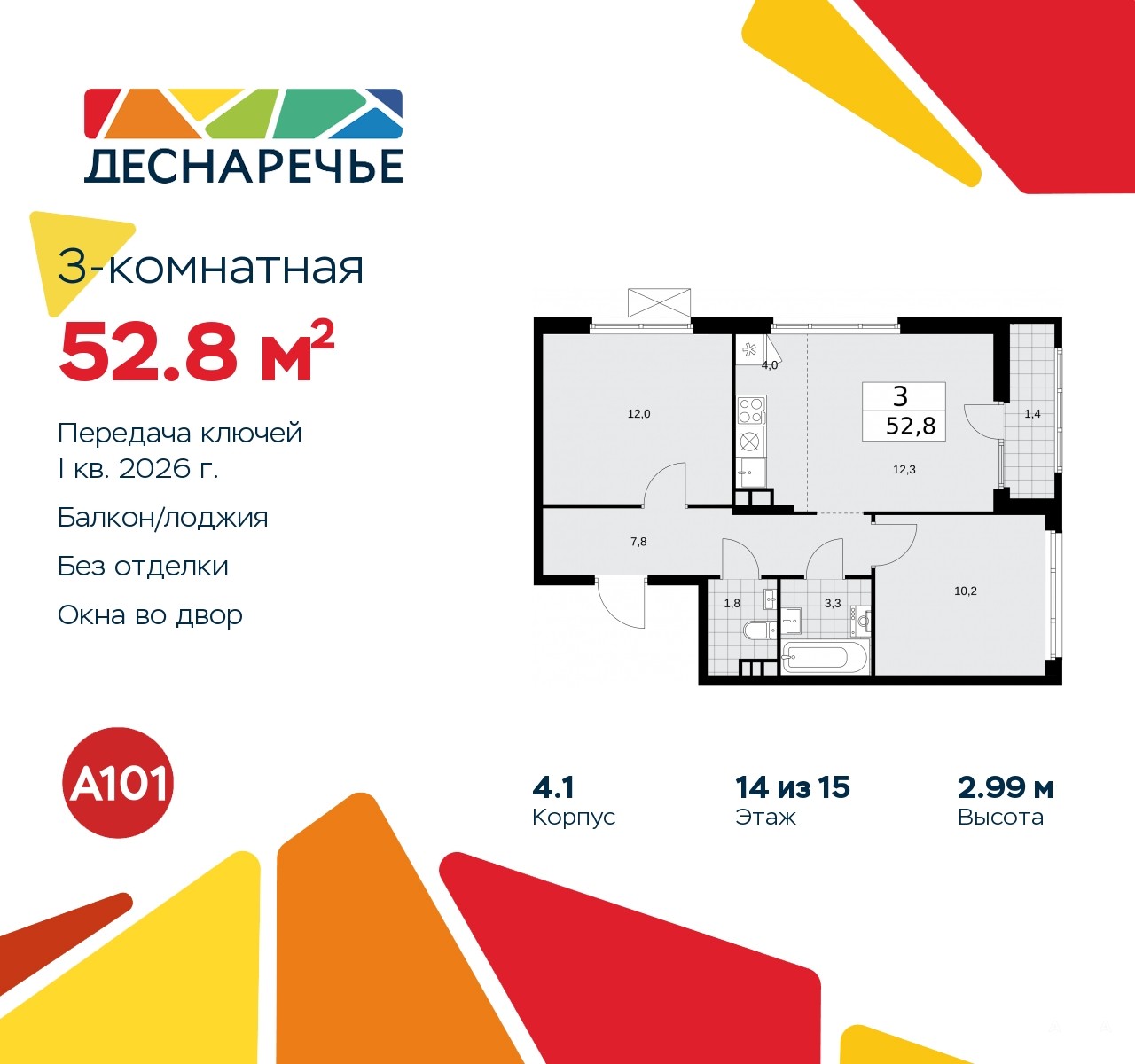 Трехкомнатная квартира с европланировкой от застройщика в ЖК "Деснаречье" на 14 этаже. Квартира без отделки, после оформления собственности можно делать ремонт. Общая площадь: 52.8 кв.м., жилая: 34.5 кв.м., общая площадь гостиной-столовой с кухонной зоной: 16.3 кв.м. Европейская планировка, зона гостиной комнаты объединена с кухней. Квартира угловая, очень светлая, естественная вентиляция при открытии окон. В квартире одна лоджия, один раздельный санузел. Высота потолков 2.99 м.