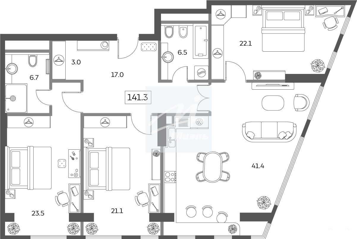 ПЛАНИРОВКА: - КУХНЯ-ГОСТИНАЯ - МАСТЕР-СПАЛЬНЯ С ВАННОЙ КОМНАТОЙ И ГАРДЕРОБНОЙ - ДВЕ КОМНАТЫ СВОБОДНОГО НАЗНАЧЕНИЯ (СПАЛЬНЯ/ДЕТСКАЯ/КАБИНЕТ) - ВАННАЯ КОМНАТА - ГОСТЕВОЙ С/У - ГАРДЕРОБНАЯ.