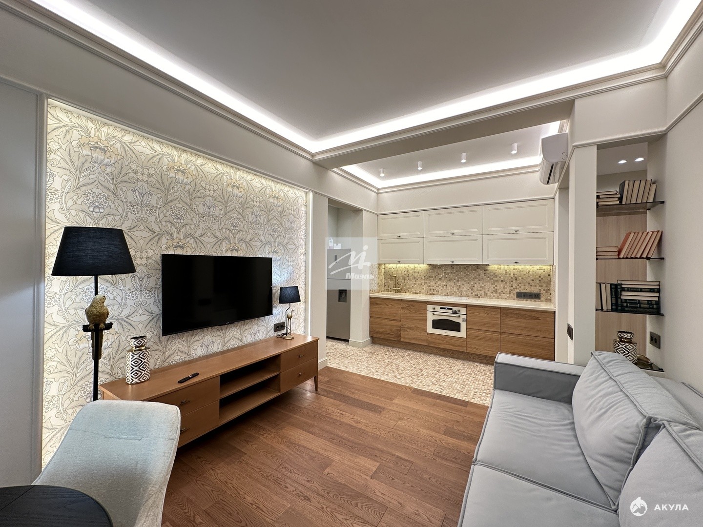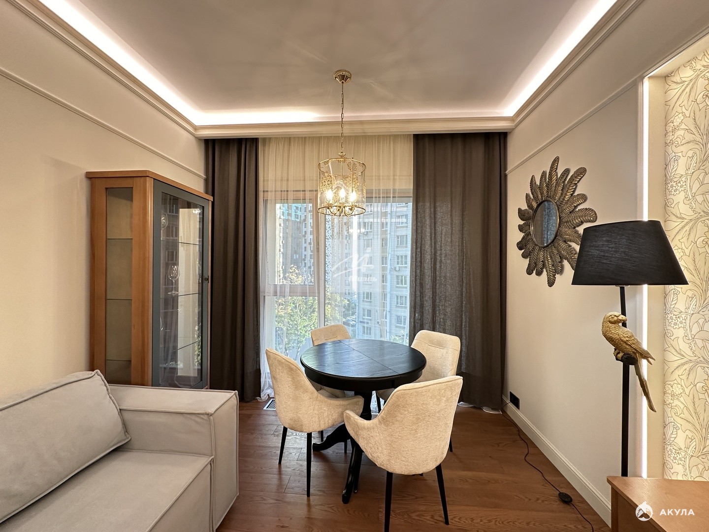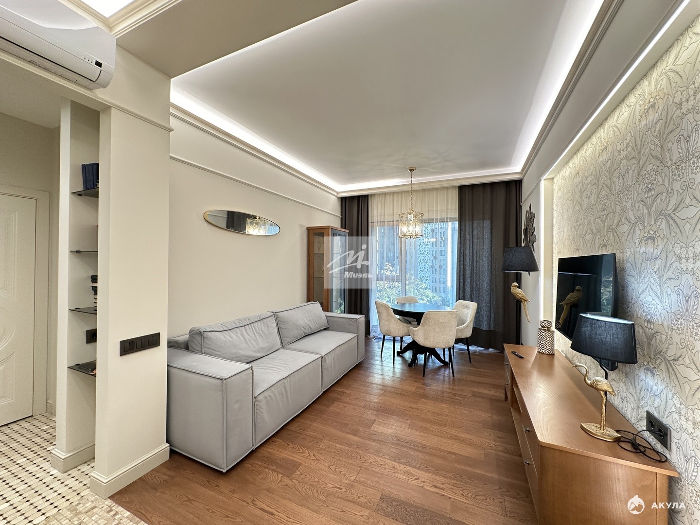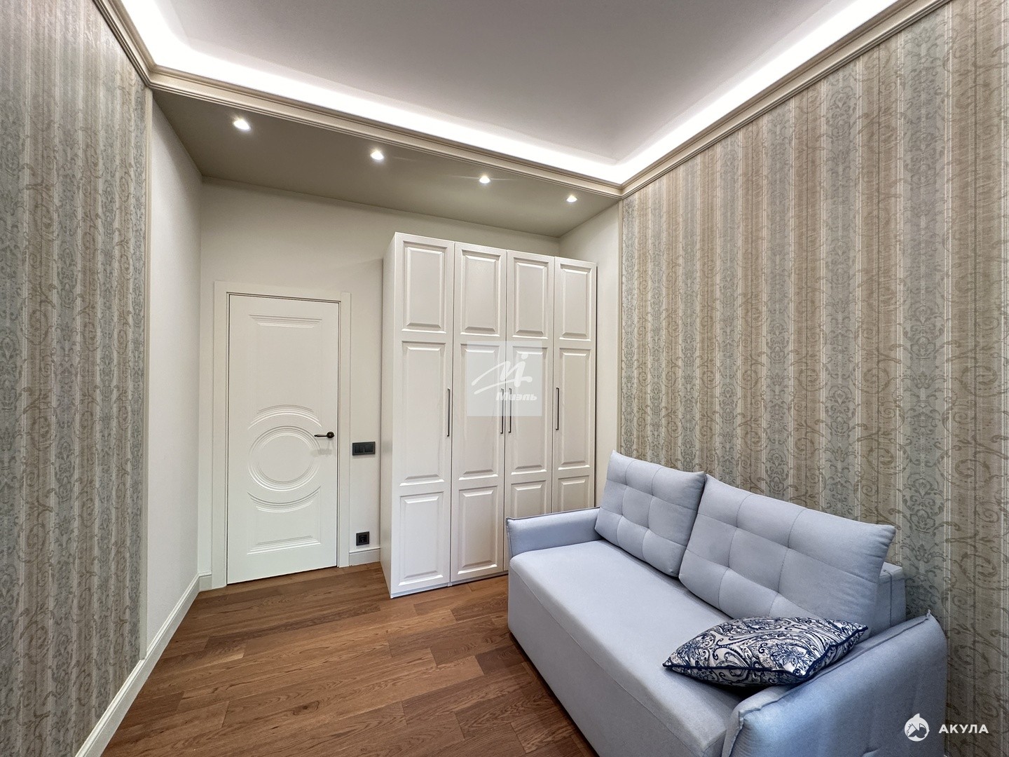 При ремонте апартаментов были использованы премиальные отделочные материалы, мебель коллекции парижский шик из шпона и эмали, кухня дуб+ эмаль с фурнитурой Блюм, в гостиной и прихожей использовано 5 сценариев освещения, которые меняют геометрию пространства.