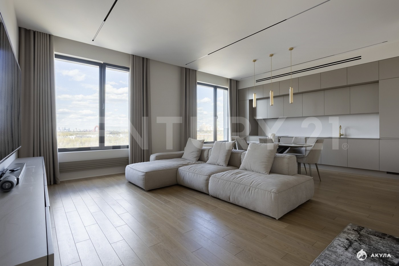 Квартира расположена на 9‑м этаже премиального корпуса — отсюда открывается завораживающий вид на реку.