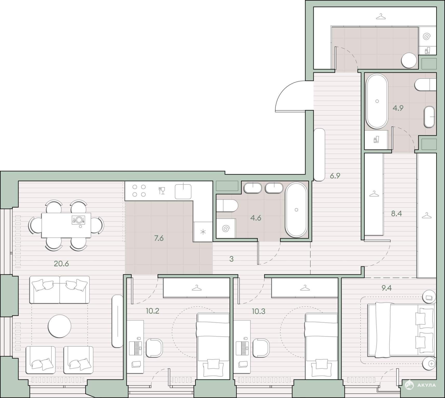 Жилая площадь 50.5 м2, кухня 7.6 м2, предчистовая отделка, комнаты изолированные.