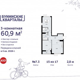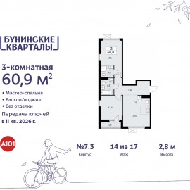 3-комн. квартира с европланировкой в ЖК "Бунинские кварталы" на 14 этаже. Квартира без отделки, после получения ключей можно делать ремонт. Общая площадь: 60.9 кв.м., жилая: 34.5 кв.м., общая площадь гостиной-столовой с кухонной зоной: 17.5 кв.м. Европейская планировка, кухня и гостиная...