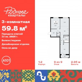 3-комн. квартира с европланировкой и отделкой в ЖК "Родные кварталы" на 9 этаже. Общая площадь: 59.8 кв.м., жилая: 33.1 кв.м., суммарная площадь гостиной-столовой с кухонной зоной: 15.9 кв.м. Европланировка, за счет большой площади кухни-гостиной квартира выглядит просторной и очень...