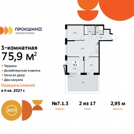 3-комн. квартира от застройщика с отделкой в ЖК "Прокшино" на 2 этаже. Общая площадь: 75.9 кв.м., жилая: 32.3 кв.м., площадь просторной кухни-столовой: 22.1 кв.м. Квартира угловая, очень светлая, естественная вентиляция при открытии окон. В квартире один балкон, два совмещенных санузла....