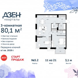 Продается трехкомнатная квартира бизнес-класса с европланировкой в ЖК "Дзен-кварталы" на 11 этаже. Квартира без отделки, после оформления собственности можно делать ремонт. Общая площадь: 80.1 кв.м., жилая: 44.1 кв.м., суммарная площадь гостиной-столовой с кухонной зоной: 30.9 кв.м....
