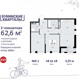 3-комн. квартира с европланировкой и отделкой в ЖК "Бунинские кварталы" на 18 этаже. Общая площадь: 62.6 кв.м., жилая: 33.6 кв.м., общая площадь гостиной-столовой с кухонной зоной: 19.9 кв.м. Европланировка, кухня-гостиная - идеальный вариант для тех, кто любит часто принимать гостей....