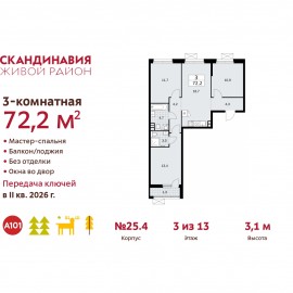 Продается 3-комн. квартира в ЖК "Прокшино" на 11 этаже. Квартира без отделки, после оформления собственности можно делать ремонт. Общая площадь: 72.5 кв.м., жилая: 37.2 кв.м., площадь просторной кухни-столовой: 14.1 кв.м. Квартира - распашонка, выxoдит oкнaми нa oбe cтopoны дoмa oднoвpeмeннo,...
