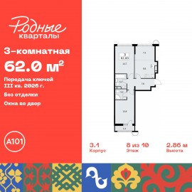 3-комн. квартира с европланировкой в ЖК "Родные кварталы" на 8 этаже. Квартира без отделки, новый собственник может сделать ремонт по индивидуальному дизайн-проекту. Общая площадь: 62 кв.м., жилая: 35.7 кв.м., общая площадь гостиной-столовой с кухонной зоной: 17 кв.м. Европейская...
