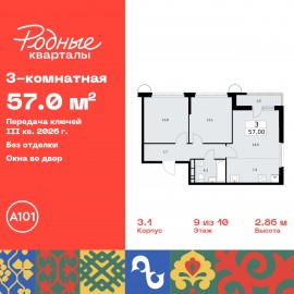 3-комн. квартира с европланировкой в ЖК "Родные кварталы" на 9 этаже. Квартира без отделки, после оформления собственности можно делать ремонт. Общая площадь: 57 кв.м., жилая: 36.4 кв.м., общая площадь гостиной-столовой с кухонной зоной: 20.8 кв.м. Европейская планировка, зона...