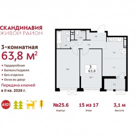 Продается 3-комн. квартира бизнес-класса с европланировкой от застройщика в ЖК "Скандинавия" на 15 этаже. Квартира без отделки, после получения ключей можно делать ремонт. Общая площадь: 63.8 кв.м., жилая: 39.2 кв.м., суммарная площадь гостиной-столовой с кухонной зоной: 15.6 кв.м....