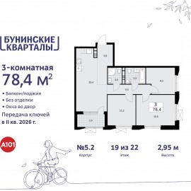 Трехкомнатная квартира в ЖК "Бунинские кварталы" на 19 этаже. Квартира без отделки, полностью готова к чистовой отделке и дальнейшему ремонту. Общая площадь: 78.4 кв.м., жилая: 36 кв.м., площадь просторной кухни-столовой: 20.4 кв.м. Квартира угловая, идеально подойдет любителям...