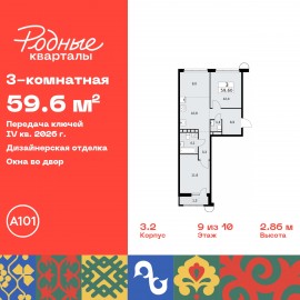 Продается 3-комн. квартира с европланировкой и отделкой в ЖК "Родные кварталы" на 9 этаже. Общая площадь: 59.6 кв.м., жилая: 31.8 кв.м., суммарная площадь гостиной-столовой с кухонной зоной: 18.8 кв.м. Европейская планировка, кухня-гостиная - идеальный вариант для тех, кто любит часто...