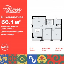 Трехкомнатная квартира с отделкой в ЖК "Родные кварталы" на 9 этаже. Общая площадь: 66.1 кв.м., жилая: 35.3 кв.м., площадь просторной кухни-столовой: 13.2 кв.м. Угловая квартира, очень светлая, естественная вентиляция при открытии окон. В квартире одна лоджия, один совмещенный и один...