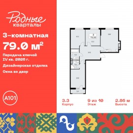 Трехкомнатная квартира с отделкой в ЖК "Родные кварталы" на 9 этаже. Общая площадь: 79 кв.м., жилая: 37.2 кв.м., площадь просторной кухни-столовой: 18.6 кв.м. Квартира - распашонка, без проходных комнат, окна выходят на paзные стороны дома. В квартире один балкон, два совмещенных...