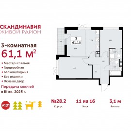 Продается 3-комн. квартира бизнес-класса с европланировкой в ЖК "Скандинавия" на 11 этаже. Квартира без отделки, полностью готова к чистовой отделке и дальнейшему ремонту. Общая площадь: 61.1 кв.м., жилая: 35.6 кв.м., общая площадь гостиной-столовой с кухонной зоной: 18.4 кв.м....
