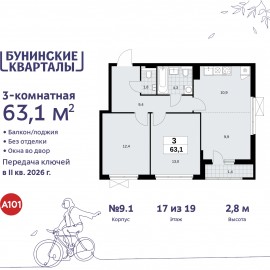 Просторная трехкомнатная квартира с европланировкой в ЖК "Бунинские кварталы" на 17 этаже. Квартира без отделки, полностью готова к чистовой отделке и дальнейшему ремонту. Общая площадь: 63.1 кв.м., жилая: 35.3 кв.м., суммарная площадь гостиной-столовой с кухонной зоной: 20.8 кв.м....