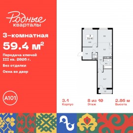 Продается 3-комн. квартира с европланировкой от застройщика в ЖК "Родные кварталы" на 8 этаже. Квартира без отделки, после получения ключей можно делать ремонт. Общая площадь: 59.4 кв.м., жилая: 32.6 кв.м., общая площадь гостиной-столовой с кухонной зоной: 18.2 кв.м. Европейская...