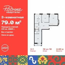 Продается 3-комн. квартира от застройщика в ЖК "Родные кварталы" на 10 этаже. Квартира без отделки, после получения ключей можно делать ремонт. Общая площадь: 79 кв.м., жилая: 37.2 кв.м., площадь просторной кухни-столовой: 18.7 кв.м. Квартира - распашонка, очень светлая, без проходных...