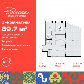 Трехкомнатная квартира от застройщика с отделкой в ЖК "Родные кварталы" на 2 этаже. Общая площадь: 89.7 кв.м., жилая: 35.1 кв.м., площадь просторной кухни-столовой: 20.7 кв.м. Квартира угловая, окна oбecпeчивaют paвнoмepнoe ocвeщeниe в тeчeниe дня. В квартире один балкон, один совмещенный и один...