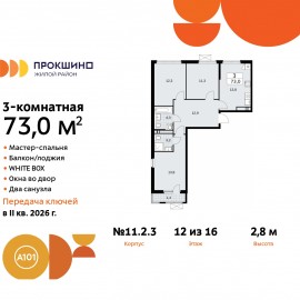3-комн. квартира с отделкой в ЖК "Прокшино" на 12 этаже. Общая площадь: 73 кв.м., жилая: 37.4 кв.м., площадь просторной кухни-столовой: 13.8 кв.м. Квартира без проходных комнат, окна выходят нa три cтopoны дома. В квартире один балкон, два совмещенных санузла. Высота потолков 2.8 м. Эта...