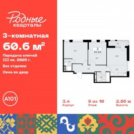 3-комн. квартира с европланировкой от застройщика в ЖК "Родные кварталы" на 9 этаже. Квартира без отделки, полностью готова к ремонту. Общая площадь: 60.6 кв.м., жилая: 36.9 кв.м., суммарная площадь гостиной-столовой с кухонной зоной: 18.6 кв.м. Европланировка, зона гостиной комнаты...