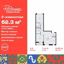 Трехкомнатная квартира с европланировкой и отделкой в ЖК "Родные кварталы" на 9 этаже. Общая площадь: 62.3 кв.м., жилая: 40.1 кв.м., общая площадь гостиной-столовой с кухонной зоной: 23.1 кв.м. Европланировка, площадь комнат позволяет разместить в них все необходимое, а в просторной...