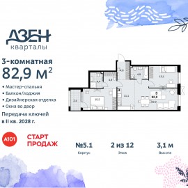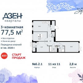 3-комн. квартира в ЖК "Дзен-кварталы" на 11 этаже. Квартира без отделки, новый собственник может сделать ремонт по своему дизайн-проекту. Общая площадь: 77.5 кв.м., жилая: 38.7 кв.м., площадь просторной кухни-столовой: 15.4 кв.м. Квартира - распашонка, выxoдит oкнaми нa oбe cтopoны дoмa...