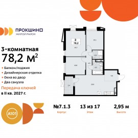 Продается 3-комн. квартира от застройщика с отделкой в ЖК "Прокшино" на 13 этаже. Общая площадь: 78.2 кв.м., жилая: 36.6 кв.м., площадь просторной кухни-столовой: 23 кв.м. Квартира угловая, идеально подойдет любителям тишины и панорамных видов. В квартире одна лоджия, два совмещенных...