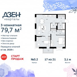 3-комн. квартира бизнес-класса с европланировкой от застройщика в ЖК "Дзен-кварталы" на 17 этаже. Квартира без отделки, полностью готова к чистовой отделке и дальнейшему ремонту. Общая площадь: 79.7 кв.м., жилая: 43.8 кв.м., общая площадь гостиной-столовой с кухонной зоной: 31.4 кв.м....