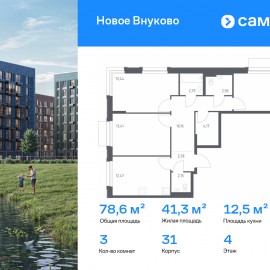 Строим кварталы для жизни с заботой о будущем. Предлагается 3-комнатная квартира комфорт-класса 78, 55 кв.м в корпусе 31 на 4 этаже, в ЖК «Новое Внуково» Квартира с предчистовой отделкой. Доступность дополнительных опций уточняйте у застройщика. Приобрести квартиру возможно...