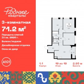 Трехкомнатная квартира с отделкой в ЖК "Родные кварталы" на 10 этаже. Общая площадь: 71.2 кв.м., жилая: 28.9 кв.м., площадь просторной кухни-столовой: 10 кв.м. Квартира угловая, очень светлая, естественная вентиляция при открытии окон. В квартире одна лоджия, один совмещенный и один...