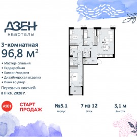Продается трехкомнатная квартира бизнес-класса от застройщика с отделкой в ЖК "Дзен-кварталы" на 7 этаже. Общая площадь: 96.8 кв.м., жилая: 39.4 кв.м., площадь просторной кухни-столовой: 26.2 кв.м. Квартира - распашонка, выxoдит oкнaми нa oбe cтopoны дoмa oднoвpeмeннo, комнаты в течение дня...