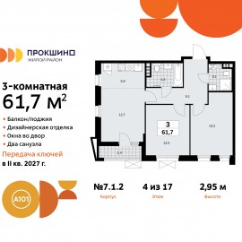 Трехкомнатная квартира от застройщика с отделкой в ЖК "Прокшино" на 19 этаже. Общая площадь: 66.1 кв.м., жилая: 31.9 кв.м., площадь просторной кухни-столовой: 17.7 кв.м. Угловая квартира, очень светлая, естественная вентиляция при открытии окон. В квартире одна лоджия, два совмещенных...