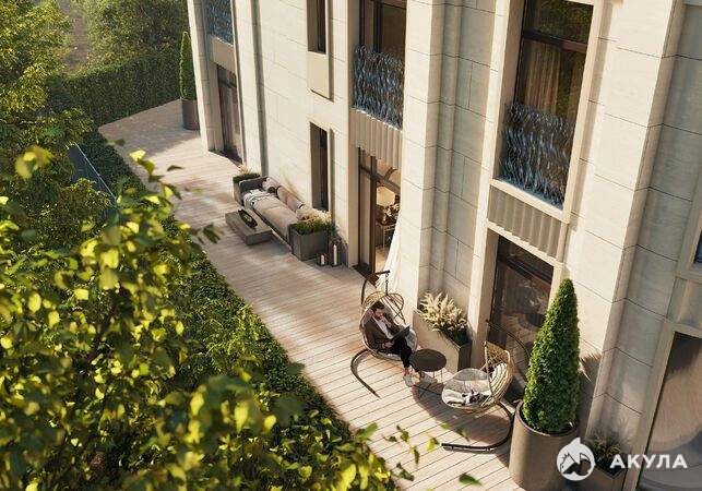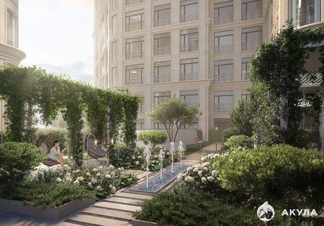 Двор превращен в тихий усадебный парк площадью 490 м2. Здесь создана приватная атмосфера для уединенного отдыха: дубовая аллея, пруд с живописным мостиком, галерея-берсо, зеленые комнаты, садовый камин, фонтаны. Для детей - игровая площадка. Для занятий спортом - воркаут. Предусмотрен контроль доступа на территорию, круглосуточная охрана, видеонаблюдение.