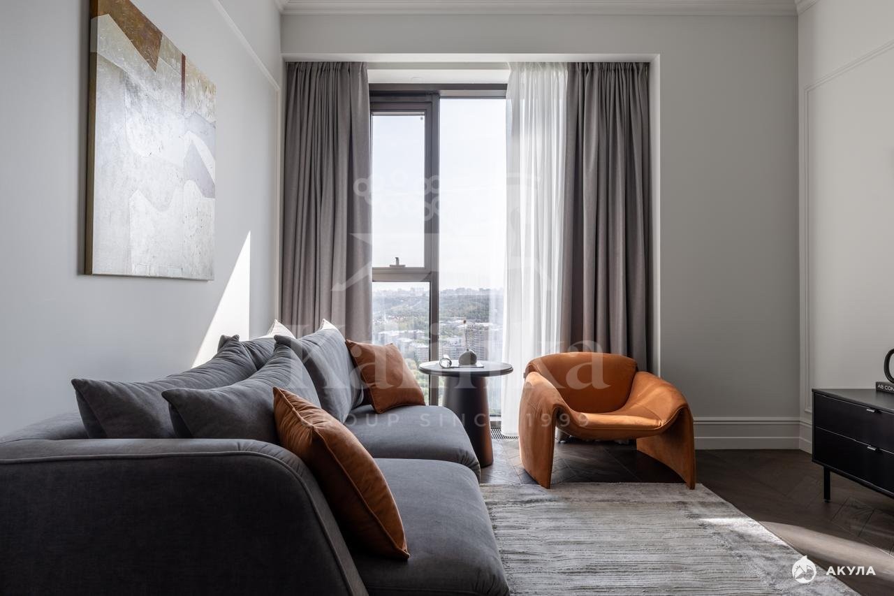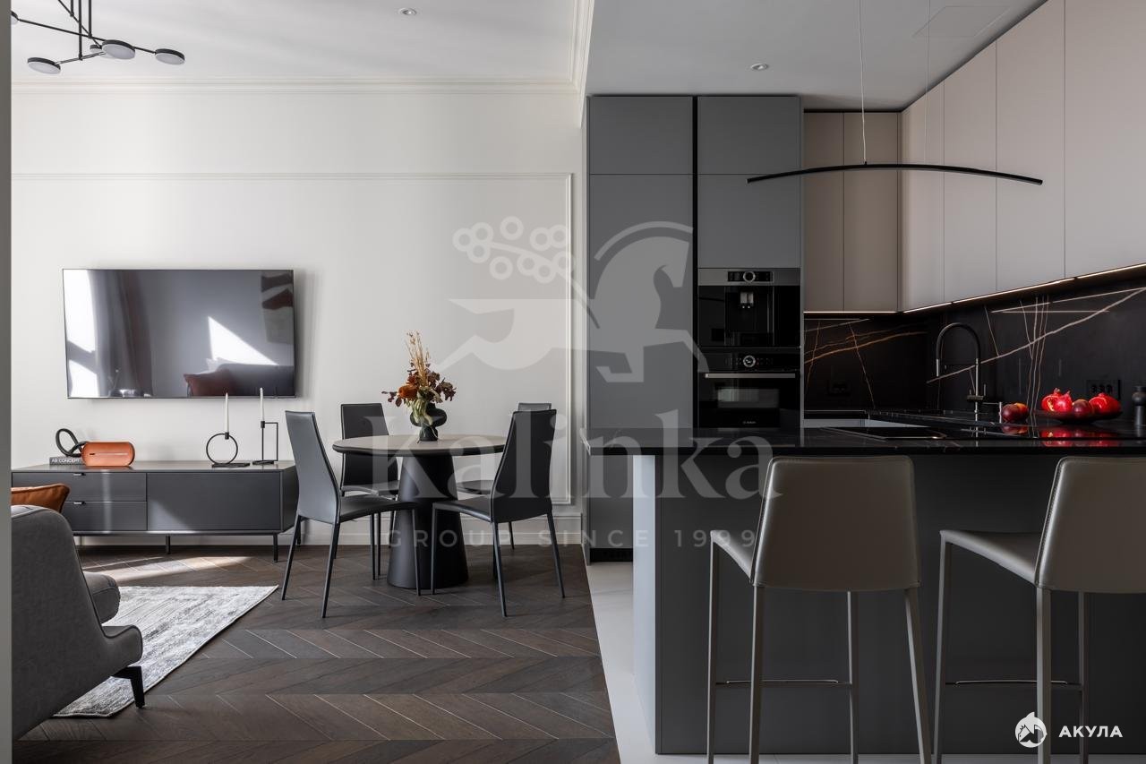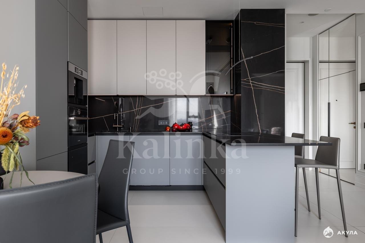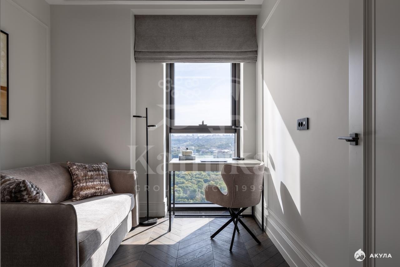Апартаменты находятся на 28 этаже. Премиальная отделка в стиле Classic. Кухня оснащена всей необходимой встроенной бытовой техникой ведущих брендов. Планировкой предусмотрено: просторная кухня-гостиная, мастер-спальня со своей ванной, детская комната или кабинет, гостевой санузел.