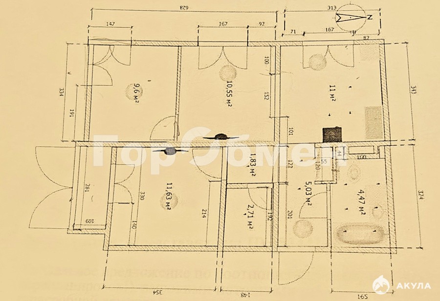 ЕВРО-ТРЕШКА, угловая квартира, комнаты смежно-изолированные (11.6-10.5-9.6).