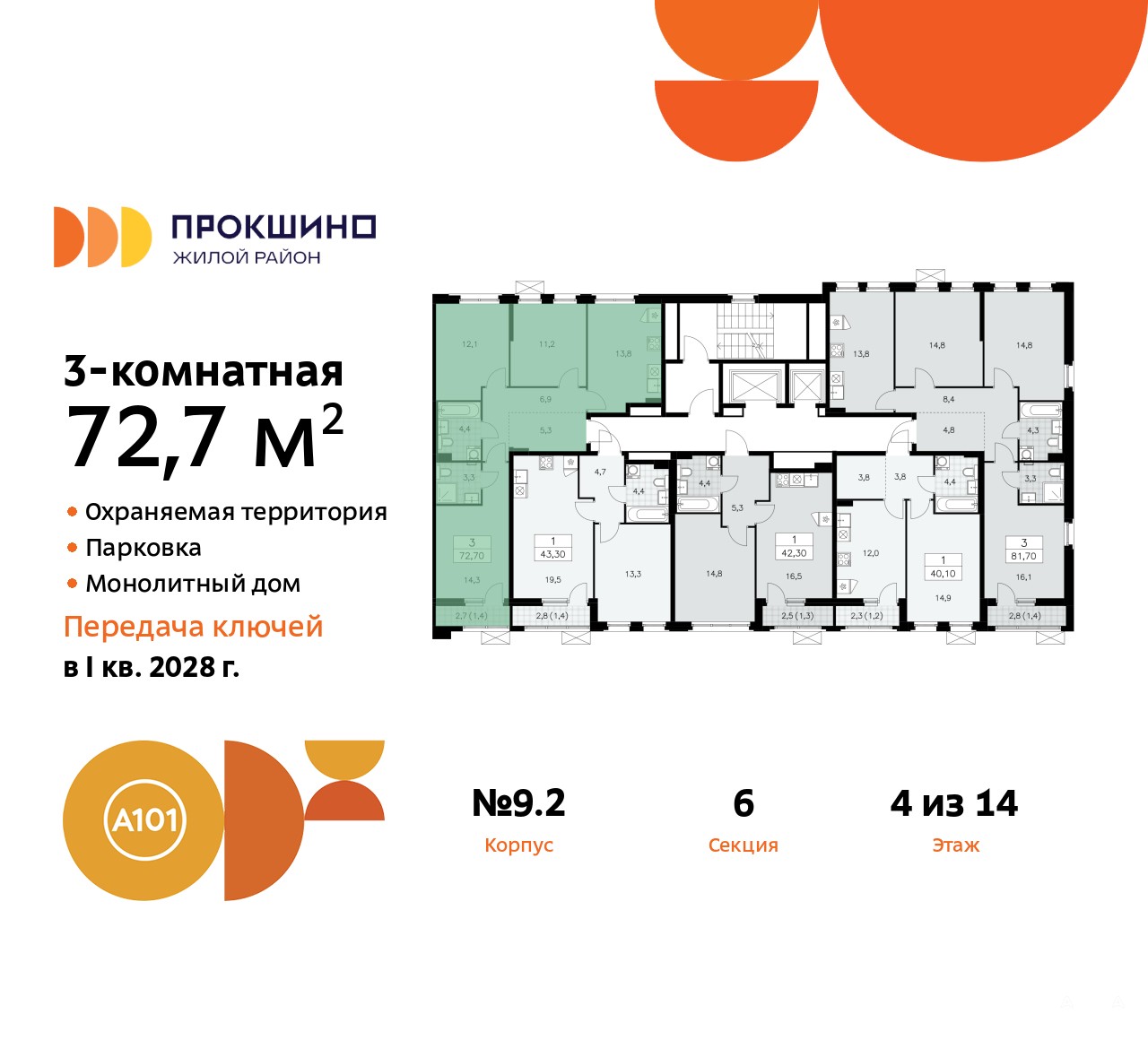 Просторная трехкомнатная квартира в ЖК "Прокшино" на 4 этаже. Квартира без отделки, новый владелец может сделать ремонт по индивидуальному проекту. Общая площадь: 72.7 кв.м., жилая: 37.6 кв.м., площадь просторной кухни-столовой: 13.8 кв.м. Квартира - распашонка, без проходных комнат, окна выходят на paзные стороны дома. В квартире один балкон, два совмещенных санузла. Высота потолков 2.95 м.