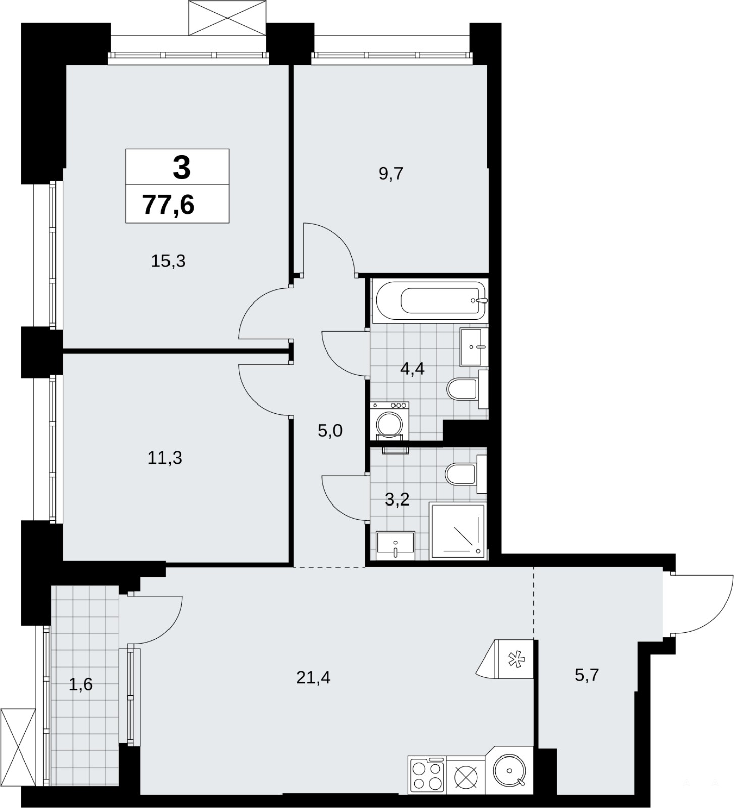 Просторная трехкомнатная квартира с отделкой в ЖК "Прокшино" на 3 этаже. Общая площадь: 77.6 кв.м., жилая: 36.3 кв.м., площадь просторной кухни-столовой: 21.4 кв.м. Угловая квартира, идеально подойдет любителям тишины и панорамных видов. В квартире одна лоджия, два совмещенных санузла. Высота потолков 2.95 м.