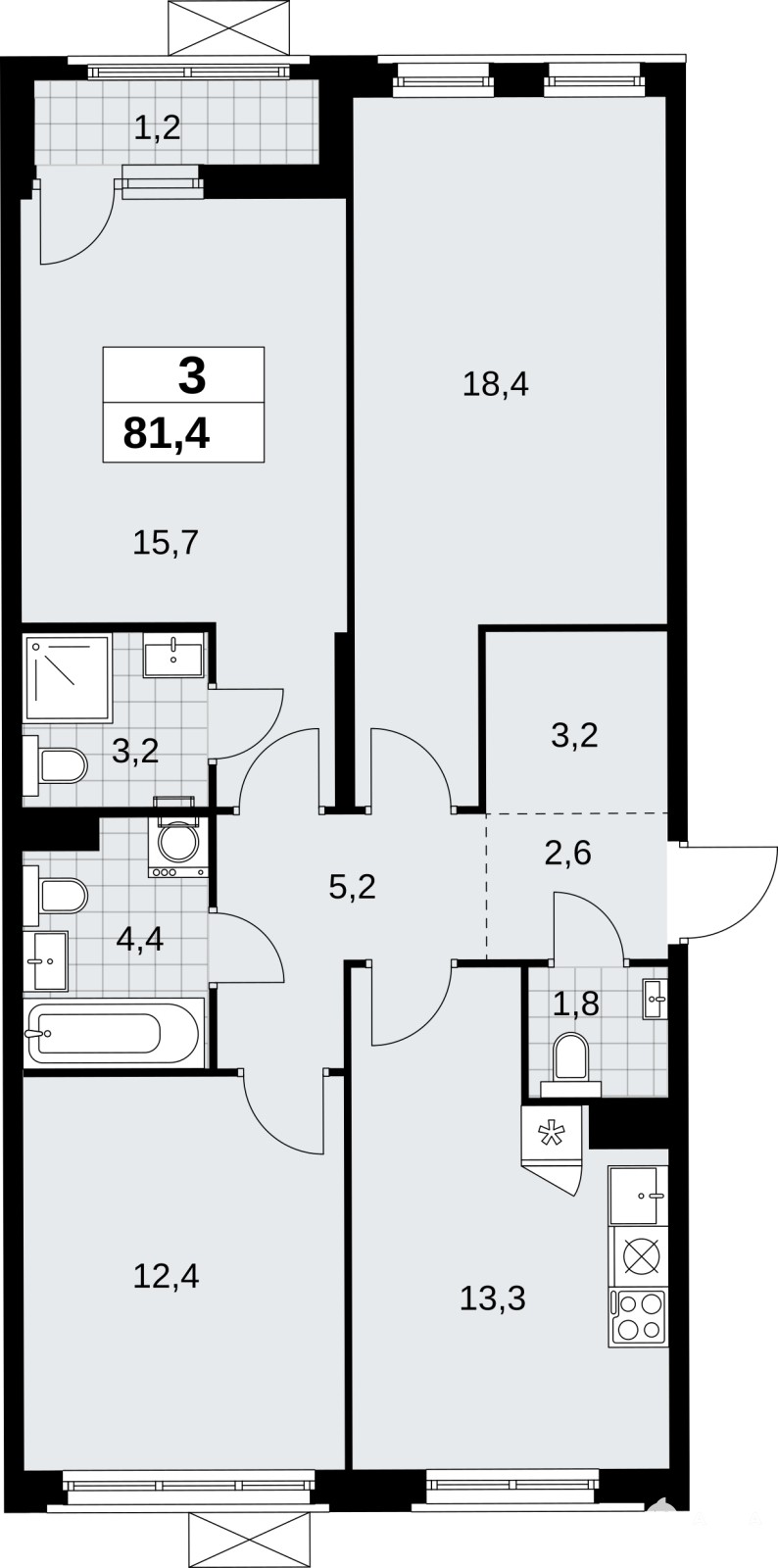 3-комн. квартира от застройщика в ЖК "Прокшино" на 10 этаже. Квартира без отделки, после выдачи ключей можно делать ремонт. Общая площадь: 81.4 кв.м., жилая: 46.5 кв.м., площадь просторной кухни-столовой: 13.3 кв.м. Квартира - распашонка, без проходных комнат, окна выходят на paзные стороны дома. В квартире одна лоджия, два совмещенных и один раздельный санузел. Высота потолков 2.95 м.