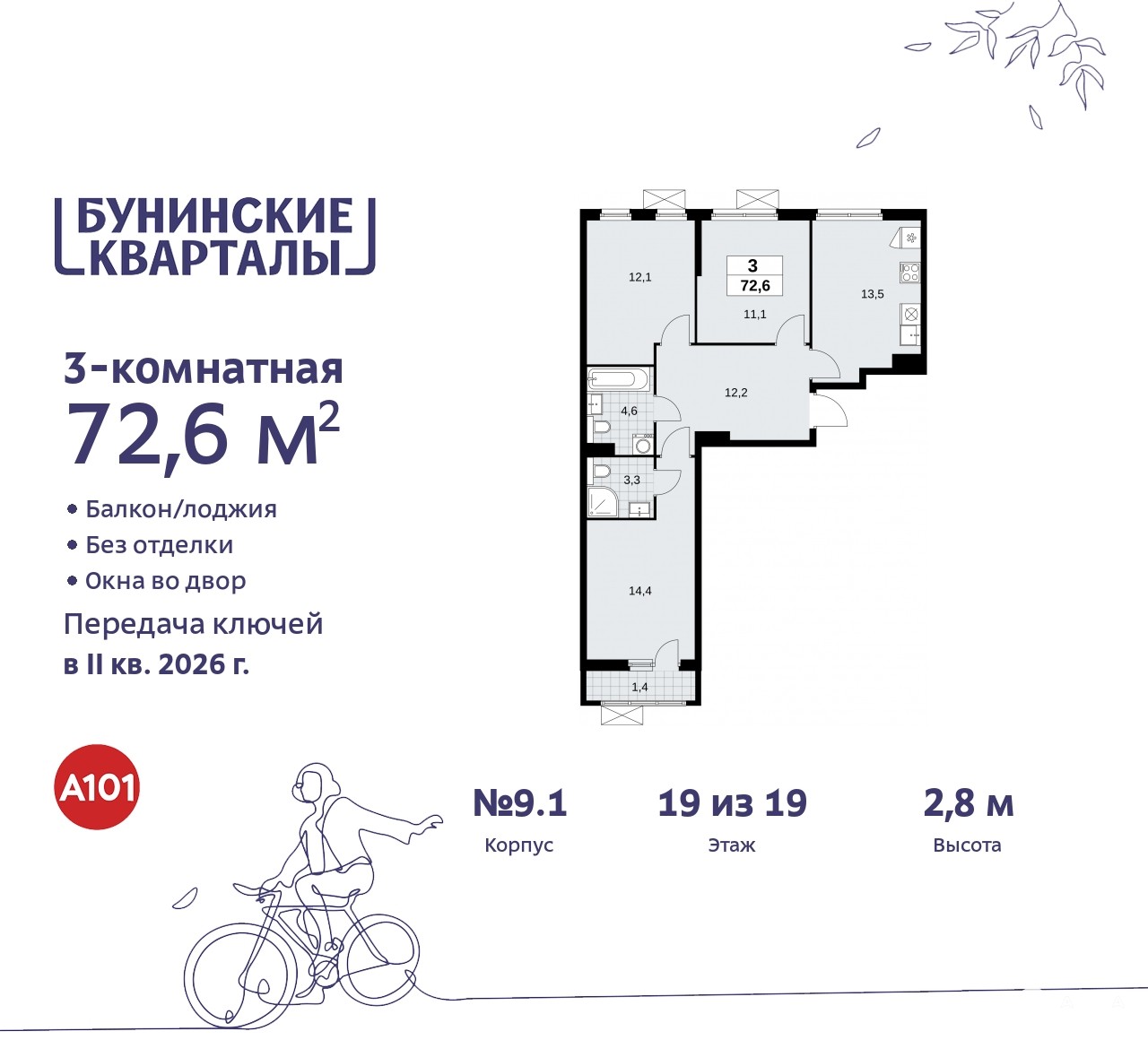 Продается трехкомнатная квартира в ЖК "Бунинские кварталы" на 19 этаже. Квартира без отделки, новый владелец может сделать ремонт по своему проекту. Общая площадь: 72.6 кв.м., жилая: 37.6 кв.м., площадь просторной кухни-столовой: 13.5 кв.м. Квартира - распашонка, без проходных комнат, окна выходят на paзные стороны дома. В квартире один балкон, два совмещенных санузла. Высота потолков 2.8 м.
