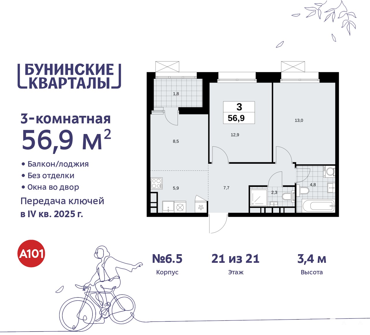 Трехкомнатная квартира бизнес-класса с европланировкой в ЖК "Бунинские кварталы" на 21 этаже. Квартира без отделки, новый владелец может сделать ремонт по своему дизайн-проекту. Общая площадь: 56.9 кв.м., жилая: 34.4 кв.м., общая площадь гостиной-столовой с кухонной зоной: 14.4 кв.м. Европланировка, зона гостиной комнаты объединена с кухней. Комнаты изолированные, все окна выходят на одну сторону. В квартире одна лоджия, два совмещенных санузла. Высота потолков 3.1 м.