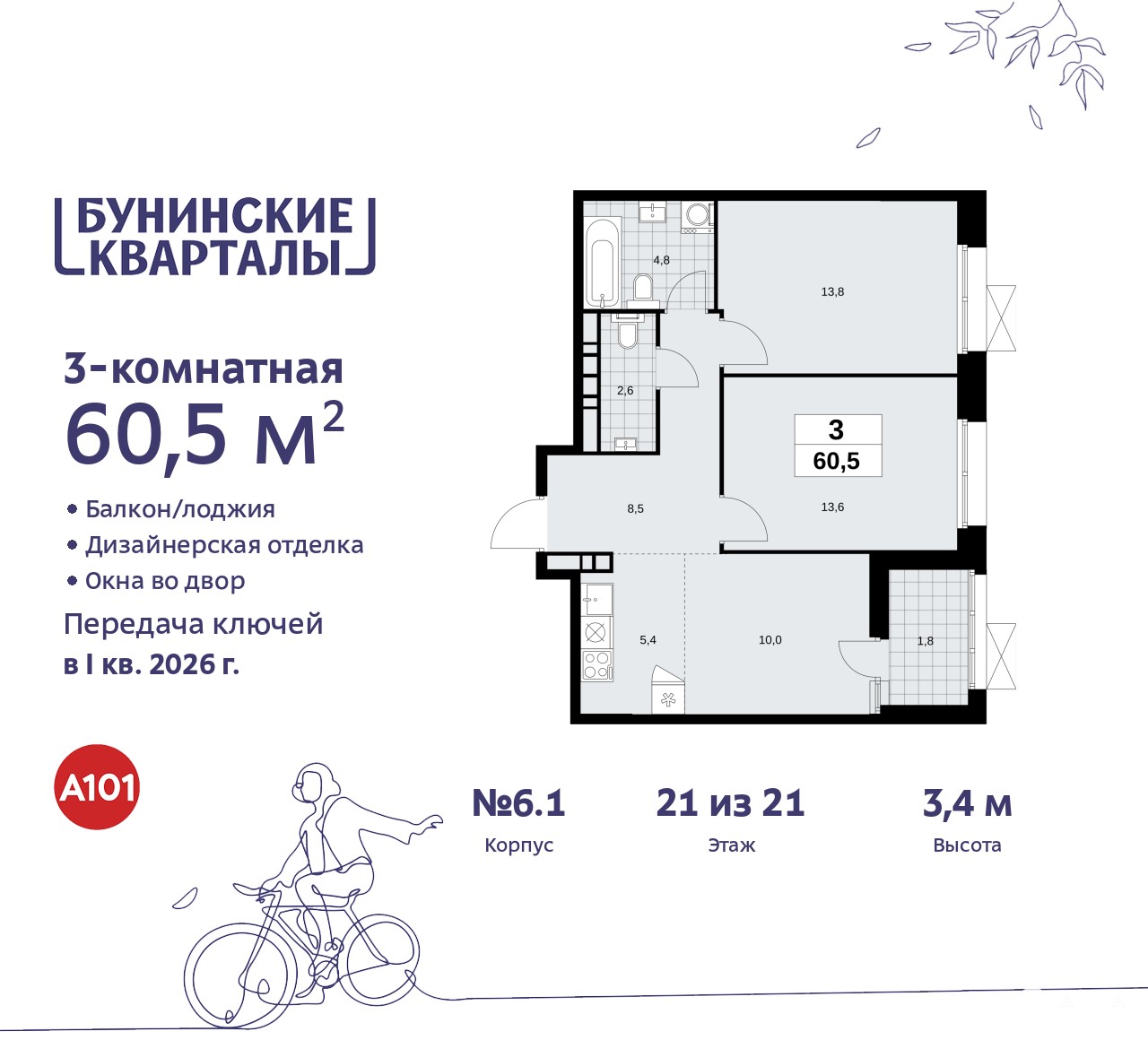3-комн. квартира бизнес-класса с европланировкой и отделкой в ЖК "Бунинские кварталы" на 21 этаже. Общая площадь: 60.5 кв.м., жилая: 37.4 кв.м., общая площадь гостиной-столовой с кухонной зоной: 15.4 кв.м. Европланировка, площадь комнат позволяет разместить в них все необходимое, а в просторной кухне-гостиной удобно как готовить, так и отдыхать. Комнаты изолированные, все окна выходят на одну сторону. В квартире одна лоджия, два совмещенных санузла. Высота потолков 3.1 м.