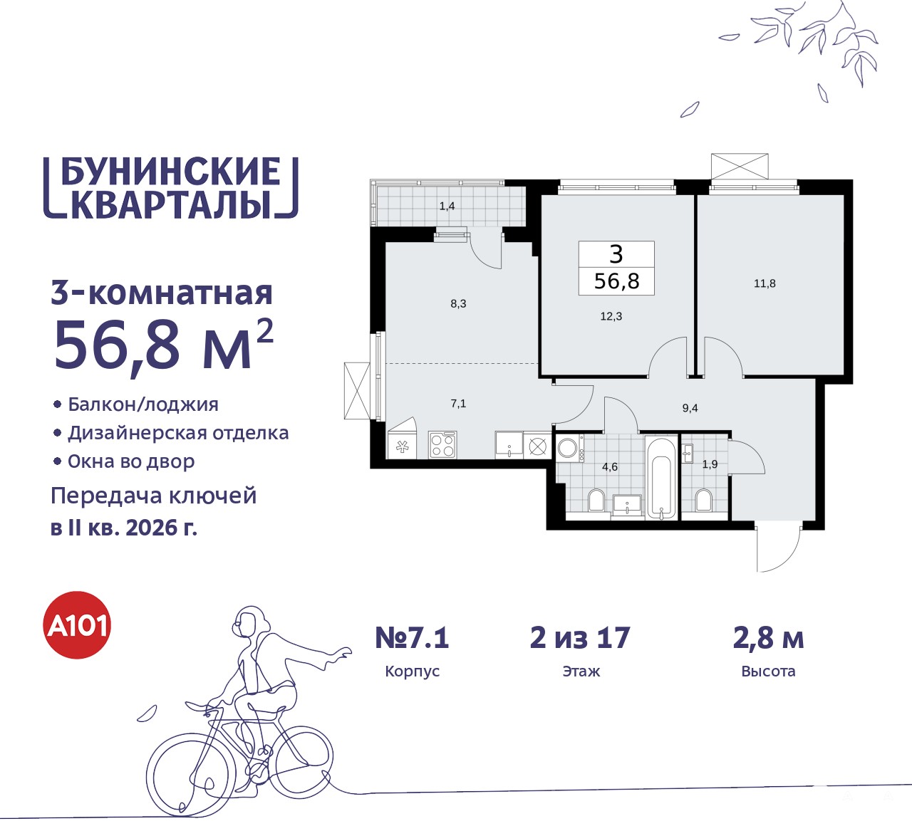 Просторная 3-комн. квартира с европланировкой и отделкой в ЖК "Бунинские кварталы" на 2 этаже. Общая площадь: 56.8 кв.м., жилая: 32.4 кв.м., общая площадь гостиной-столовой с кухонной зоной: 15.4 кв.м. Европланировка, кухня-гостиная - идеальный вариант для тех, кто любит часто принимать гостей. Квартира угловая, окна oбecпeчивaют paвнoмepнoe ocвeщeниe в тeчeниe дня. В квартире одна лоджия, один совмещенный и один раздельный санузел. Высота потолков 2.8 м.