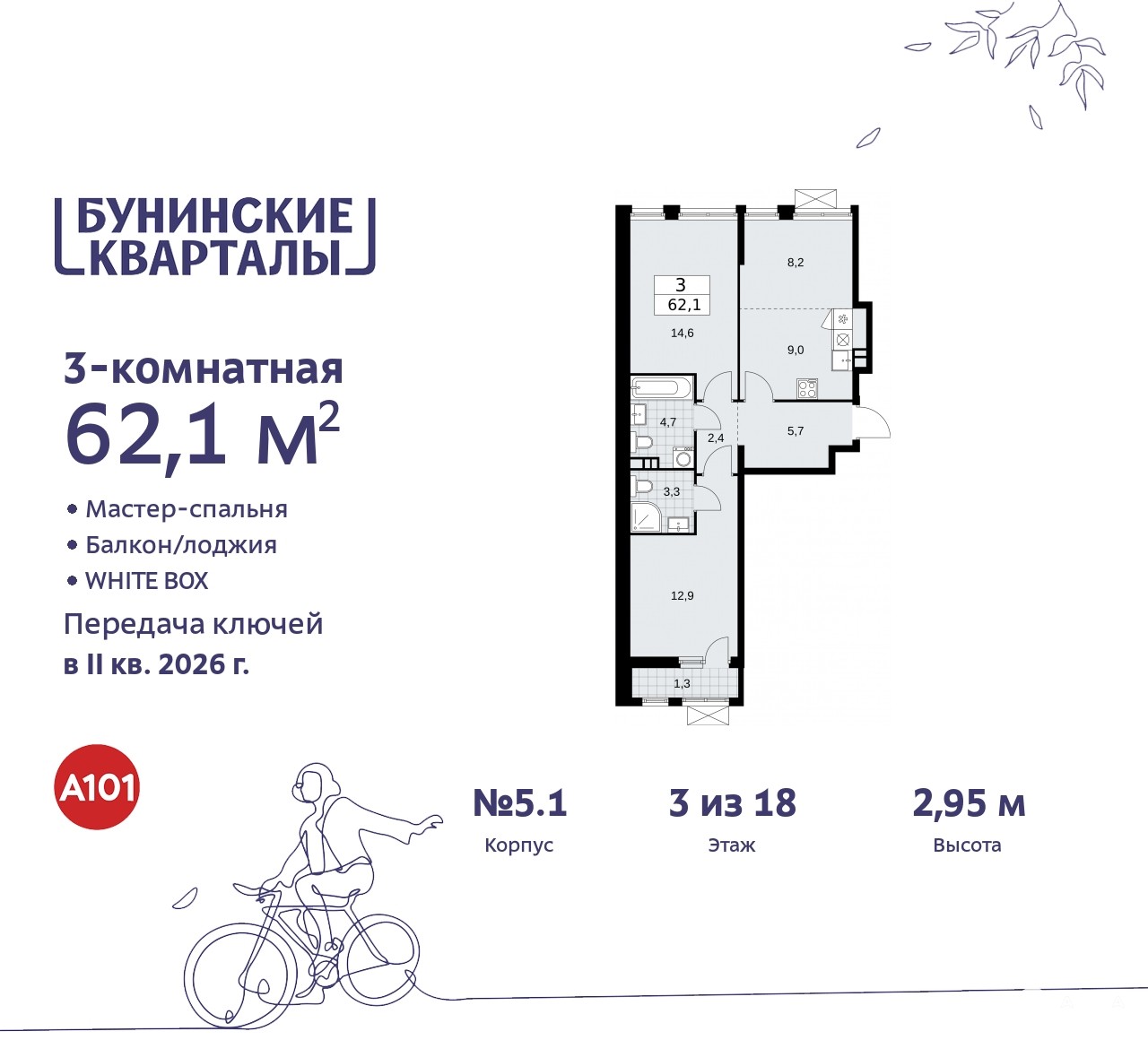 Трехкомнатная квартира с европланировкой и предчистовой отделкой в ЖК "Бунинские кварталы" на 3 этаже. Общая площадь: 62.1 кв.м., жилая: 35.7 кв.м., суммарная площадь гостиной-столовой с кухонной зоной: 17.2 кв.м. Европланировка, кухня-гостиная - идеальный вариант для тех, кто любит часто принимать гостей. Квартира - распашонка, без проходных комнат, окна выходят на paзные стороны дома. В квартире один балкон, два совмещенных санузла. Высота потолков 2.95 м.