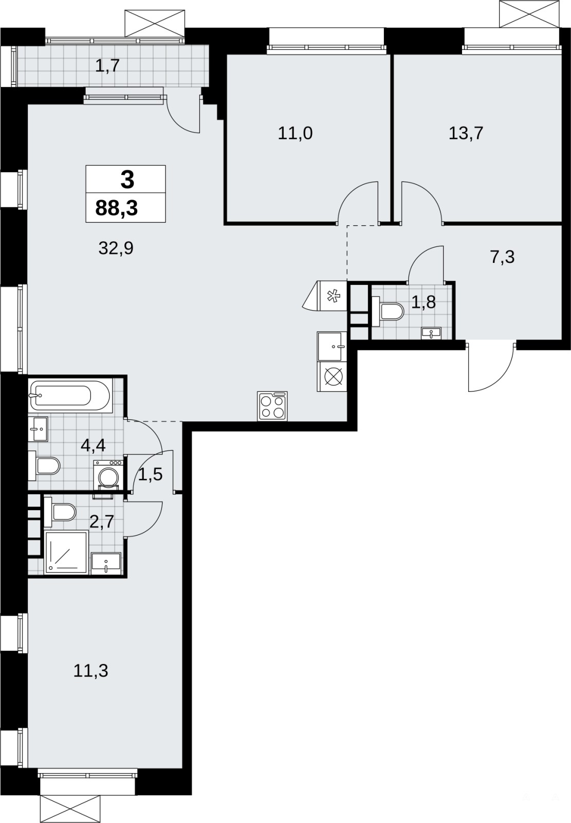 Просторная 3-комн. квартира бизнес-класса с предчистовой отделкой в ЖК "Бунинские кварталы" на 6 этаже. Общая площадь: 88.2 кв.м. Высота потолков 3.1 м.
