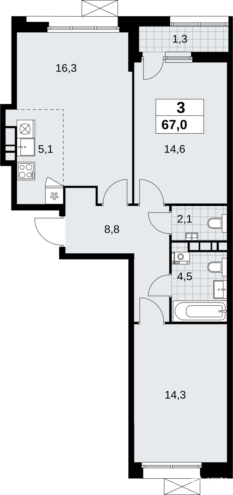 3-комн. квартира бизнес-класса с отделкой в ЖК "Бунинские кварталы" на 6 этаже. Общая площадь: 66.9 кв.м. Высота потолков 3.1 м.