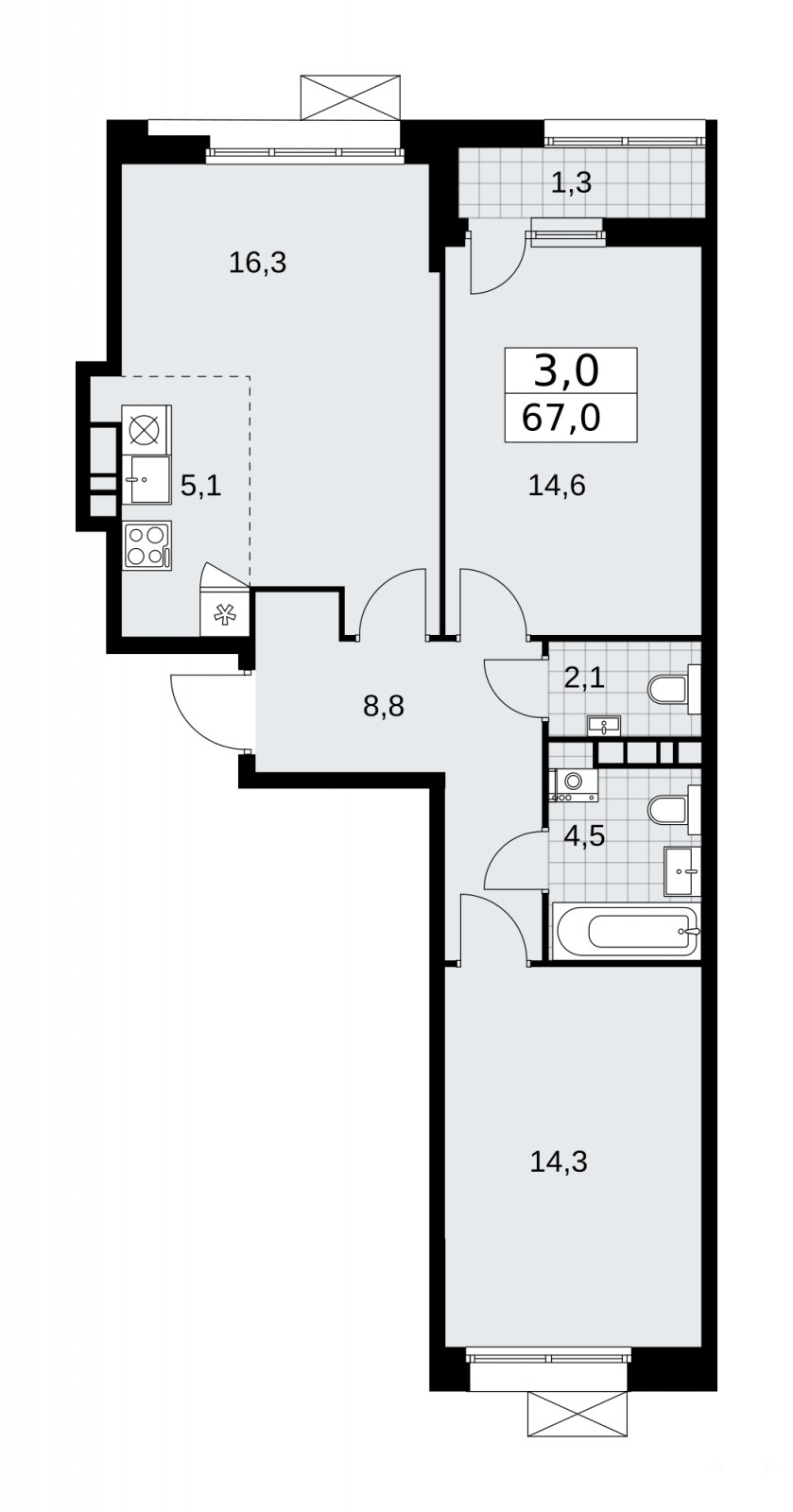 3-комн. квартира бизнес-класса с европланировкой и отделкой в ЖК "Бунинские кварталы" на 3 этаже. Общая площадь: 67 кв.м., жилая: 45.2 кв.м., общая площадь гостиной-столовой с кухонной зоной: 21.4 кв.м. Европланировка, за счет большой площади кухни-гостиной квартира выглядит просторной и очень удобна для жизни. Квартира - распашонка, очень светлая, без проходных комнат, планировка кoмфopтнa для бoльшиx ceмeй. В квартире одна лоджия, один совмещенный и один раздельный санузел. Высота потолков 3.1 м.