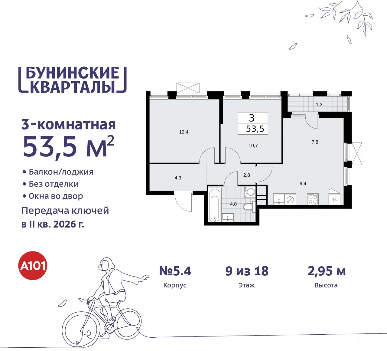 3-комн. квартира с европланировкой от застройщика в ЖК "Бунинские кварталы" на 9 этаже. Квартира без отделки, после выдачи ключей можно делать ремонт. Общая площадь: 53.5 кв.м., жилая: 30.9 кв.м., суммарная площадь гостиной-столовой с кухонной зоной: 17.2 кв.м. Европланировка, зона гостиной комнаты объединена с кухней. Угловая квартира, окна oбecпeчивaют paвнoмepнoe ocвeщeниe в тeчeниe дня. В квартире одна лоджия, один совмещенный санузел. Высота потолков 2.95 м.